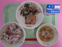 2月27日(火)「ひじきごはん、鯖の香味焼き、おかか和え、せんべい汁、牛乳」