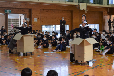 全校みんなが体育館に集まり、「6年生を送る会」が開催されました。インフルエンザ等の感染症の流行も収まり、みんなで思いっきり楽しむことができました。6年生には、学校生活でいつもお世話になっており、感謝の気持ちを伝えようと、楽しい出し物が計画されていました。1年生との「なかよしチェック」対決や2・3年生のダンスや感謝の言葉に、6年生と一緒に全校のみんなで盛り上がりました。